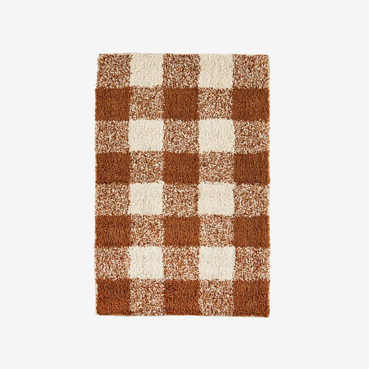 Thick cosy tufted cotton bath mat in terracotta check pattern with latex backing