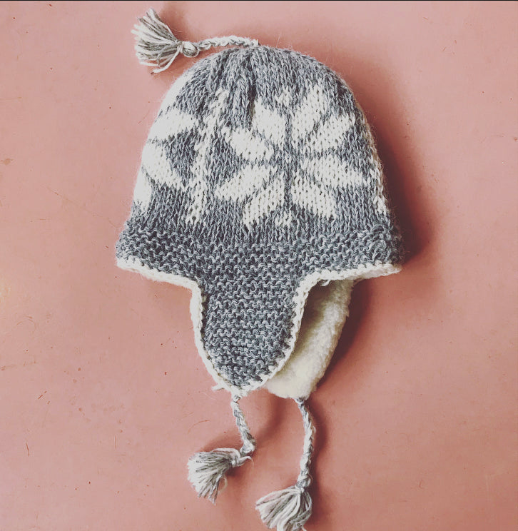 This hand knitted snowflake patterned hat is the cosiest hat we have ever tried! Lined with soft fluffy lambswool & ear warmers to boot. Go on shake your tassels